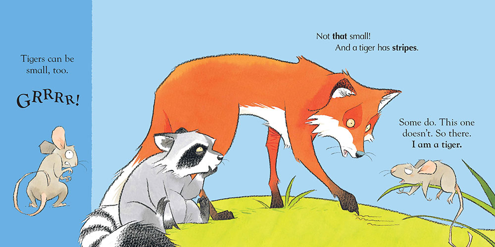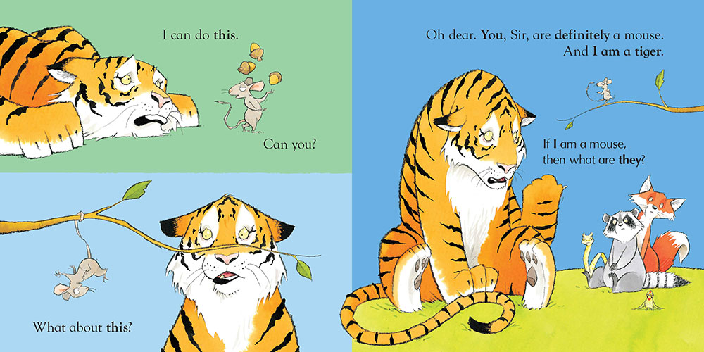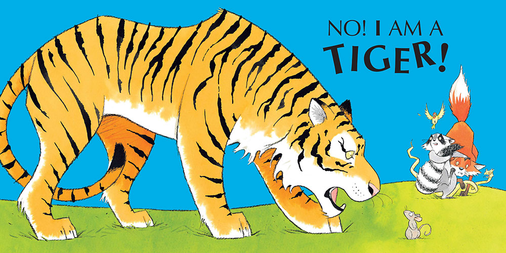 The bold little mouse declares "I am a tiger." and manages to convince a raccoon, a fox, a snake and a bird not only that this is true, but that they are not what they think they are. When a real tiger turns up, can the persuasive and fearless little rodent manage to persuade the tiger that he is a mouse?