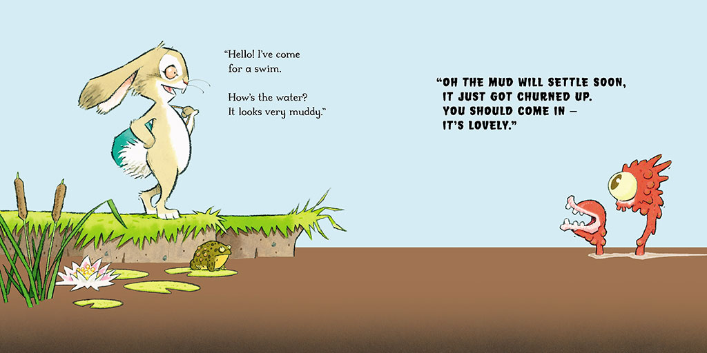 Rabbit wants to go for a swim. But is that the best idea when all the signs say "No Swimming"?