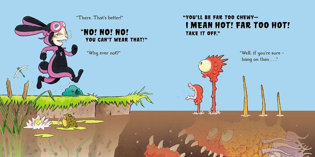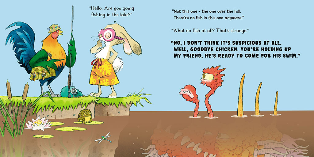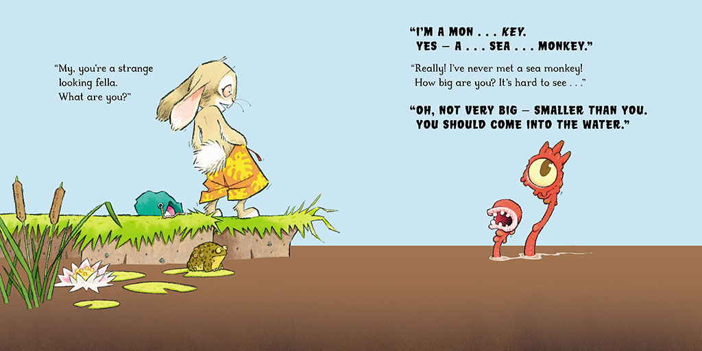 When a foolish rabbit meets a sneaky "sea monkey" inviting him in for a dip, he has questions; lots of them! What are carrots doing in a lake? Why are there no fish any more? Is the water cold? And, most importantly, is his new friend really a sea monkey? He certainly is a strange-looking fellow . . .