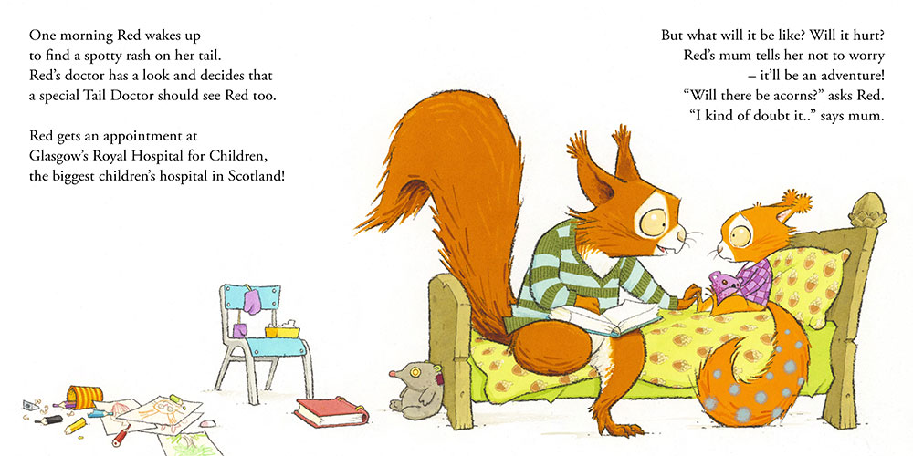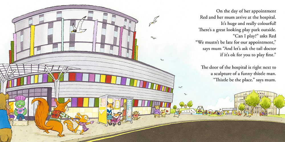 Red Visits the Hospital is a free book to support children visiting the Glasgow Children's Hospital. The story follows Red, a young squirrel who wakes up one morning to discover that her tail is covered in spots. To find out what's wrong and get the care she needs, Red embarks on a journey to the hospital-an experience filled with warmth, kindness, and reassurance. Published by Glasgow Children's Hospital Charity, Red Visits the Hospital has been carefully tailored to reflect recognisable features of the Royal Hospital for Children in Glasgow. By doing so, it aims to reduce anxiety and help young patients understand what to expect during their hospital visit in a comforting and supportive way.