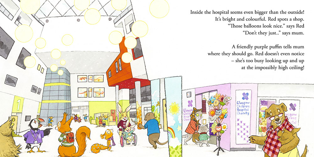 "The good people at the charity told me of the concerns some children feel when visiting the hospital for the first time. I then got to tour and draw all the places that young patients may find themselves. Together with the charity we then created Red and her story. Drawing real places in a picture book was a first for me and I loved the challenge. The whole project has honestly been a joy for me and one that I'm exceptionally proud of.