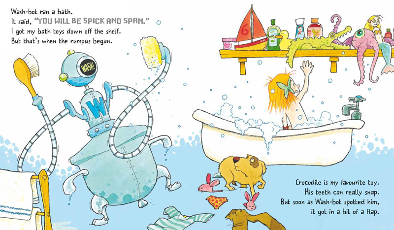 "I can't say who enjoyed this story more, myself or the children. We were all in stitches and the children had tears streaming down their faces as they laughed so hard I can only be thankful they had been to the loo before story time. The story itself is brilliant, told in a delightful rhyming text. The pictures are perfectly matched, illustrating each scene so that a child could appreciate the story from the pictures alone. Ross Collins has really brought the whole story to life with his beautiful, colourful illustrations, certain to enchant any child. I can't imagine any child who wouldn't enjoy this story, whether they like robots or not. It is simply one of the funniest children's books we have ever found. This is one of those books you just have to get completely involved in, using robotic voices and movements, crying out shrill alarms, and everyone joining in to shout out the parents scream of dismay. I can't recommend this book highly enough. Your children will love it."